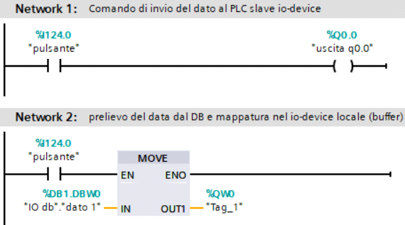 Il contenuto della funzione FC1 del PLC master io-device è il seguente, in cui vediamo il caricamento del buffer di trasmissione costituito dalla word che vogliamo trasmettere.