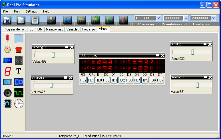 Il file temperature_LCD.rpp configura in maniera automatica il pannello "Visual" predisponendo i cursori di simulazione del segnale analogico ai canali AN0,AN1,AN2,AN3 e i corretti collegamenti, per una comunicazione a 8 bit, con il display.