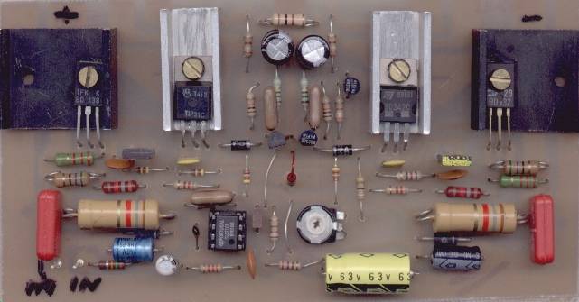 Lato componenti, questo prototipo evidenzia alcune lacune del Layout, non vi è una distribuzione elegante dei componenti, i reofori sono spesso storti come anche l'allineamento. Alcune resistenze sono montate con la tolleranza verso destra e altre verso sinistra quindi il tecnico senza "occhio clinico" è costretto a ruotare la scheda per una agevole lettura del valore ohmmico. Poco chiari risultano essere i "riccioli" sui reofori di alcune resistenze che potrebbero introdurre un fenomeno induttivo parassita innescando anche ronzii e sensibilità ai campi elettromagnetici. I dissipatori sono decisamente poco eleganti ma il loro montaggio orizzontale potrebbe favorire lo smaltimento del calore che viene ceduto anche alla basetta.