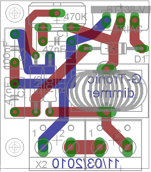 L'innesco del componente di potenza (Triac) avviene tramite il superamento della tensione di conduzione del diodo Diac il quale consentirą la scarica del condensatore sia durante la semionda positiva che quella negativa. Il rapido impulso che ne deriva circola nella maglia in cui č inserito il gate del Triac riportando le cariche nell'armatura opposta del condensatore che č soggetto al fenomeno di scarica. L'induttanza L1 č un filtro antidisturbo che impedisce al "click" di innesco di propagarsi sulla rete disturbando altri apparecchi connessi al medesimo impianto. Nel realizzare il prototipo č stato utilizzato un come core un nucleo a "toro" recuperato da un vecchio alimentatore per PC. Senza L1 il circuito funzionerą ugualmente. Per quanto riguarda il collegamento del potenziometro di regolazione bisognerą portare due fili dalla posizione indicata sulla basetta ( vedi scritta potenz. sul lato rame ) e saldarli sui pin del potenziometro ( pin centrale e pin destro guardando il componente con l'astina di regolazione verso l'osservatore), mentre il pin di sinistra verrą ponticellato con quello centrale.