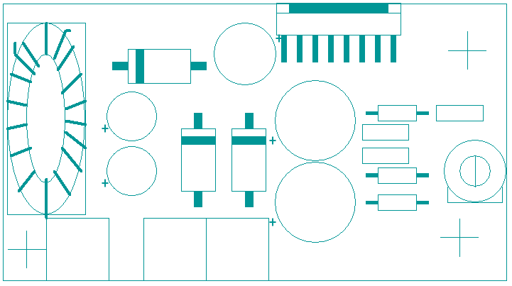il disegno sovrastante mostra lo sbroglio del circuito eseguito con il FidoCad, in nero sono state evidenziate le piste che costituiscono la massa. Il primo morsetto a vite sulla sinistra è l'uscita positiva regolata. I primi tre morsetti da destra sono l'ingresso ed a essi andranno collegati gli avvolgimenti del secondario del trasformatore con l'avvertenza di collegare al centro la presa centrale di esso.