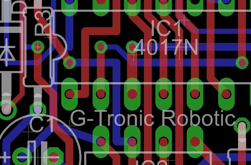 E' importante osservare che il vias (foro passante che collega il TOP layer con il BOTTOM layer) collegato direttamente al PIN 2 del CD4017 non risulti sovrapposto alla pista azzurra che nella versione errata scorre parallela lungo tutta la fila dei pin del 4017, ma che in questa versione corretta è in realtà spezzata permettendo l'uscita del 7 dell'NE555 verso la resistenza R3.