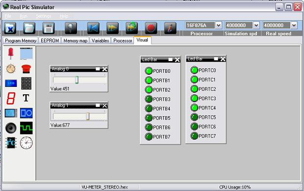 Prima di montare e collegare tra loro le 3 schede ho verificato il funzionamento logico del FIRMWARE (file.HEX) attraverso il "REAL PIC SIMULATOR" utilizzando come "segnale di picco" quello generato da due potenziometri, uno per il canale destro e l'altro per il canale sinistro, cioè il primo collegato ad AN0 e l'altro collegato con AN1.