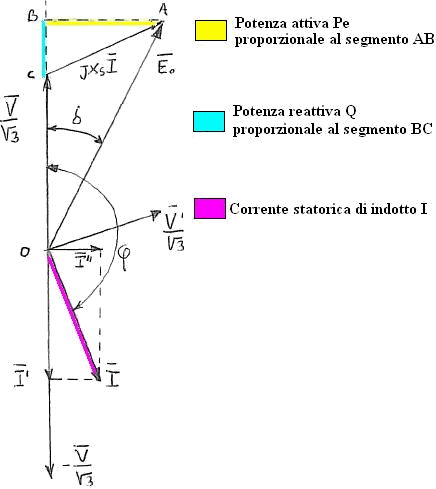 Con riferimento ad una machina non satura, dividendo per Xs i vettori del diagramma del generatore sopraeccitato, si ottiene il seguente diagramma dove il vettore V / (√3* Xs) è disposto sull’asse delle ascisse.