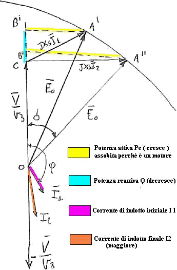 Diagramma vettoriale relativo a un motore sincrono sopraeccitato al variare del carico meccanico.