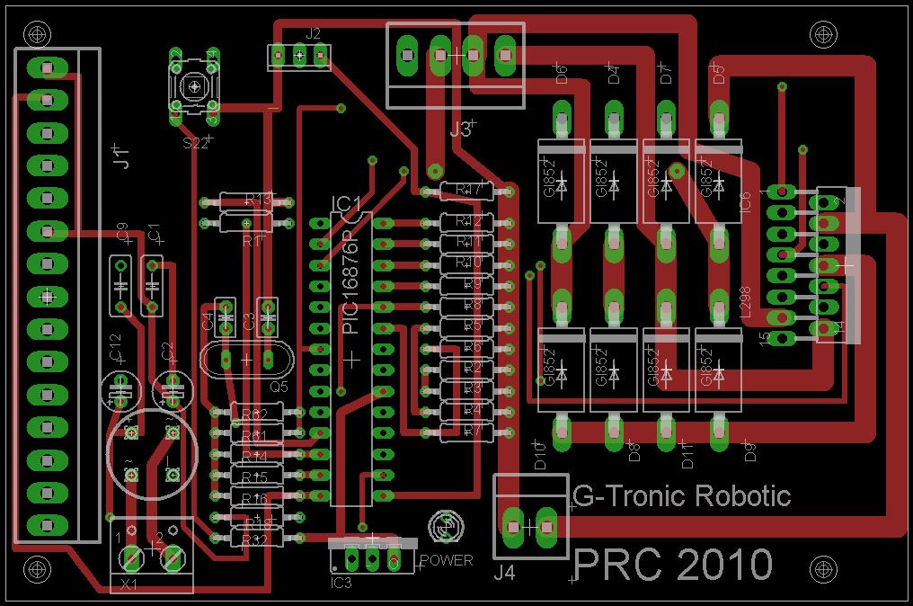 Notiamo che le piste uscenti dal connettore J4, ovvero le alimentazioni di potenza sono molto robuste, come anche le 4 linee uscenti dal circuito integrato L298. Posteriormente a questo circuito intergrato non sono stati messi altri componenti per lasciare il necessario spazio all'ampio dissipatore di calore fondamentale per un prolungato e sicuro funzionamento.