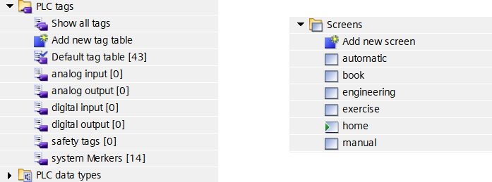 La lista delle tabelle delle tags mostra la suddivisione tra le tipologie dei segnali, analogici, digitali, per ingressi e uscite, e dei segnali provenienti dall’area safety.